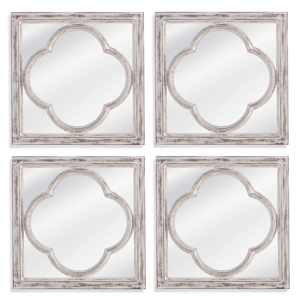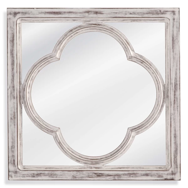 Our Alaina Mirror features a quatrefoil design overlaid on a clear mirror. It is finished in distressed white and makes a statement wall hung as multiples.