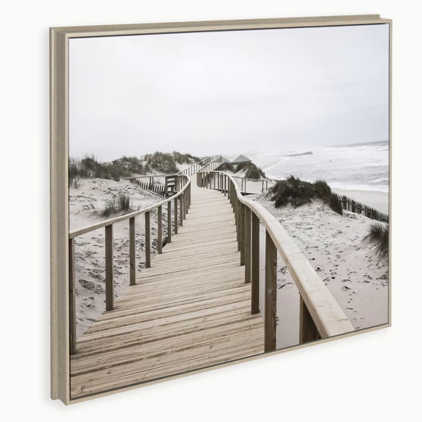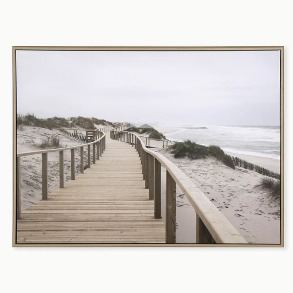 Boardwalk is a gallery-wrapped canvas set in a blonde wood tone scooped floater frame.