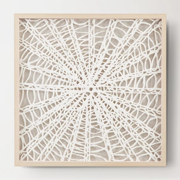 Our Canal Wall Decor is a shadow box accentuated with a silk-like neutral mat and a circular radiating pattern of woven white rice paper with a natural blonde molding. This piece of art is hand painted by a skilled artist lending itself to a unique technique and will vary slightly.