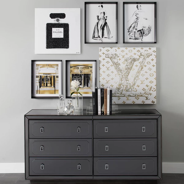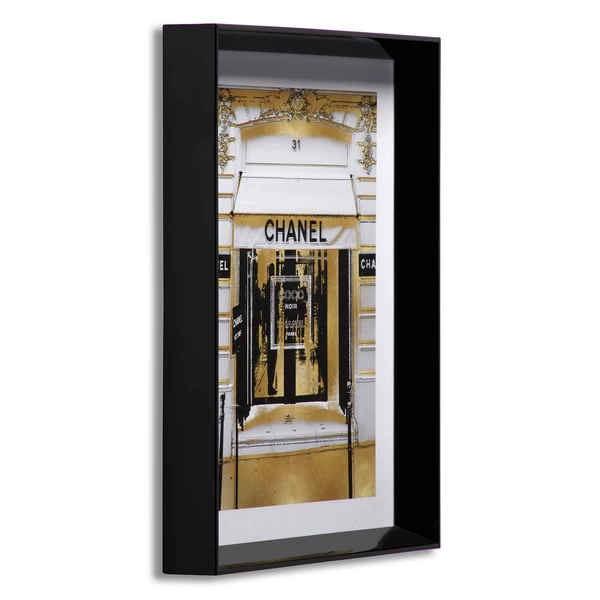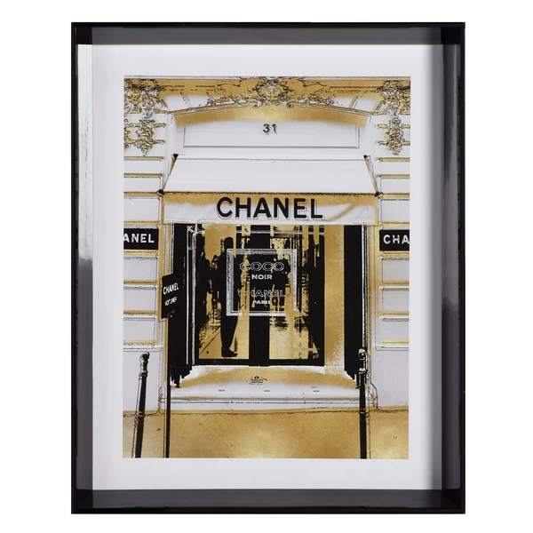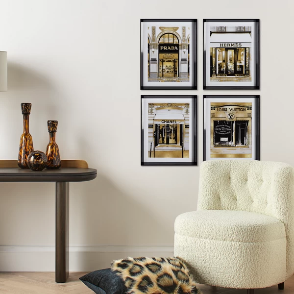 Ideal for adding a luxe note to your space, the glam storefront prints in this series are rendered in black, white, and gold and come beautifully framed.