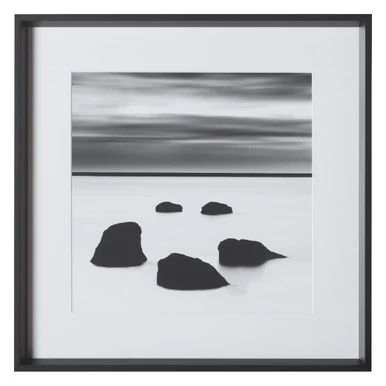 - Print set under glass with a white mat and solid wood frame with a black finish