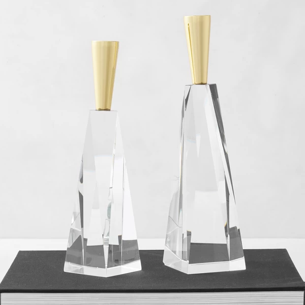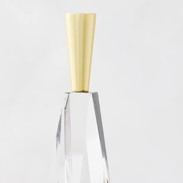 Designed with a faceted glass column and golden top, this taper holder is a stunning addition to any decor.
