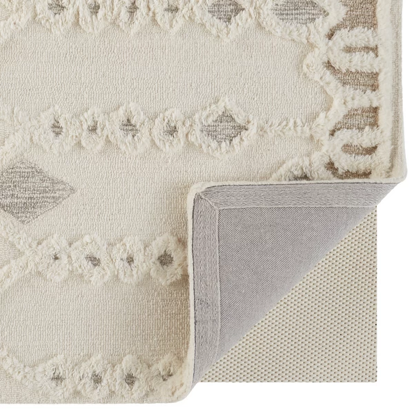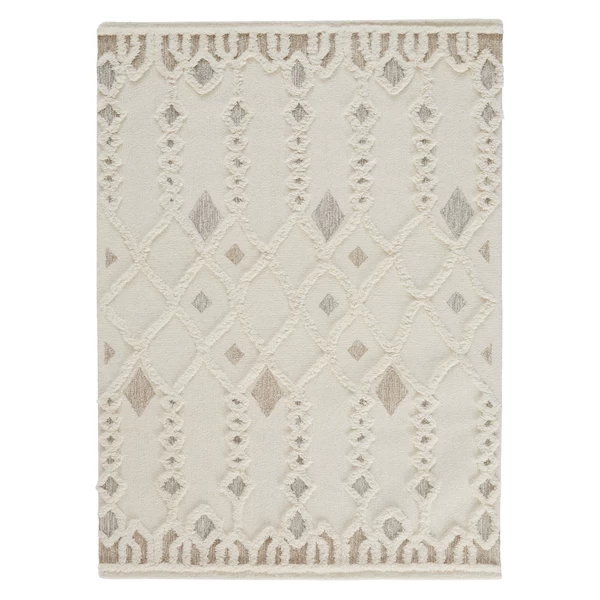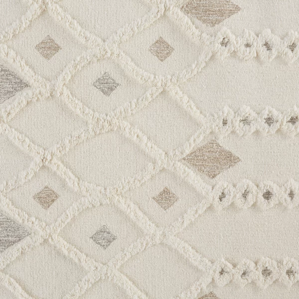 This wool rug features an eye-catching geometric design with a high-low pile that adds texture and visual interest to any space.