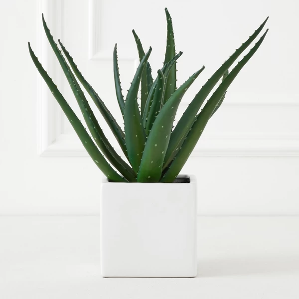 With succulents all the rage, our striking decorative Faux Aloe Plant makes a major statement. The simple graphic structure of the deep green plant in a contrasting contemporary White pot gives it a distinctly architectural look.