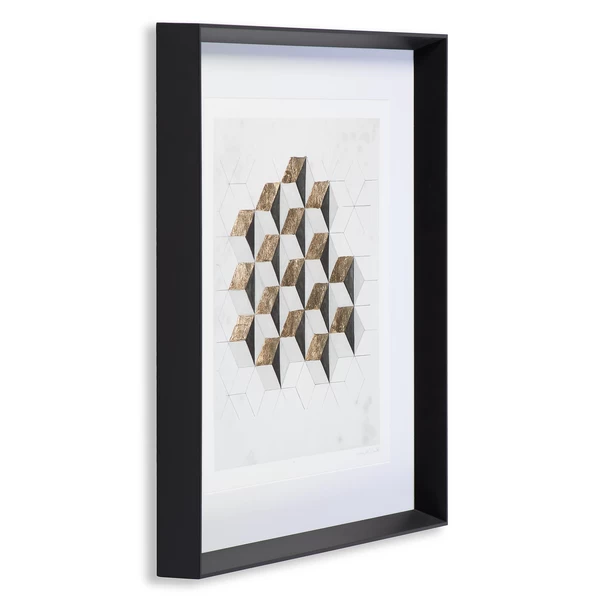 Composed of geometric shapes, this eye-catching limited-edition abstract work from Naomi McCavitt is printed on paper with hand-embellished accents. Set off with a white mat, this piece is displayed in a black frame.