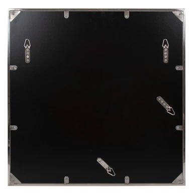 This square wall mirror is framed in black beveled glass with polished stainless steel trim for a traditional yet modern look that works well with any style of decor.