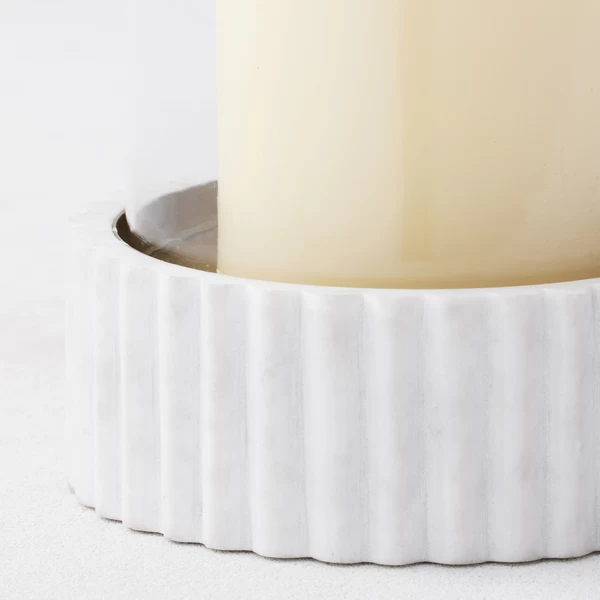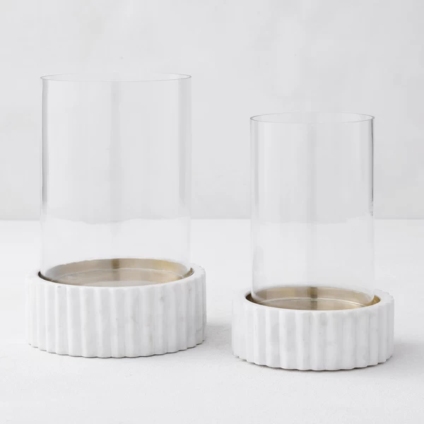 Use these hurricanes to elevate your basic pillar candle. The gilded bottom will reflect the light, and the carved marble base adds a subtle sophistication.