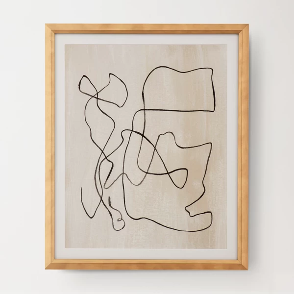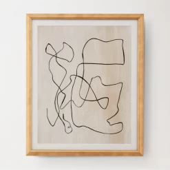 Our Maze art series features abstract ink scribbles on a cream background with white border and a simple natural wood frame.