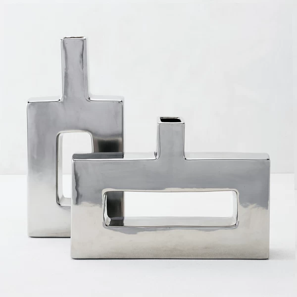 Z Gallerieās very contemporary silver-hued Miami Vases partner successful design with optional functionality. We’ve created these decorative vases exclusively for our customers to enjoy as unique sculptural pieces and/or to fill with decorative foliage. Crafted of ceramic with a stylish gold glaze, the vases are available in two sizes to create a pleasing composition when paired. Also available in Gold and White.