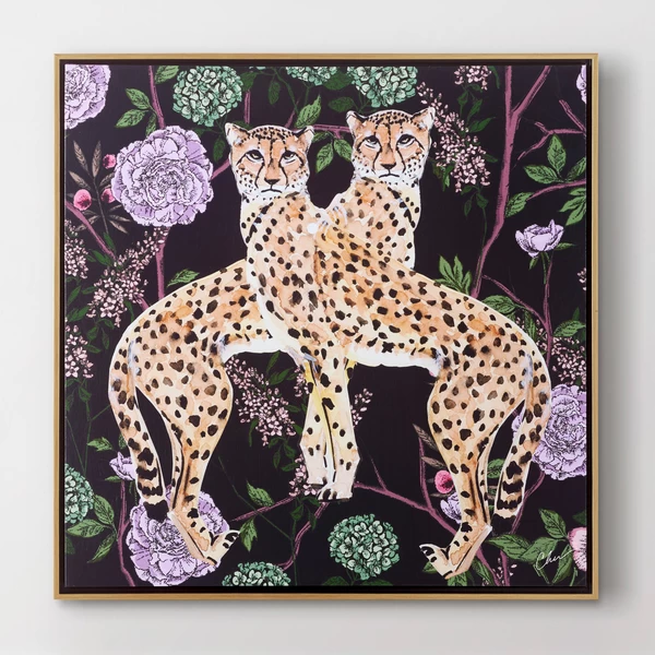 Printed on canvas with a hand-applied image brush gel finish and set in a gold floater frame, this striking work from Nikki Chu lends wild style and vibrant color to the wall.