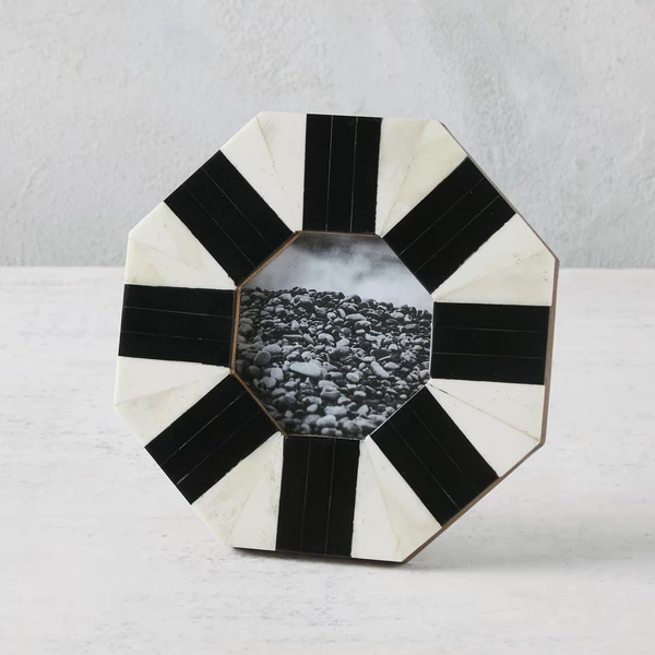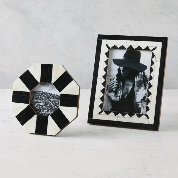 Embellished with black and natural bone tiles, this octagonal picture frame is ideal for holding a cherished photo in style. Pair with our Zeek Frame for double the impact.