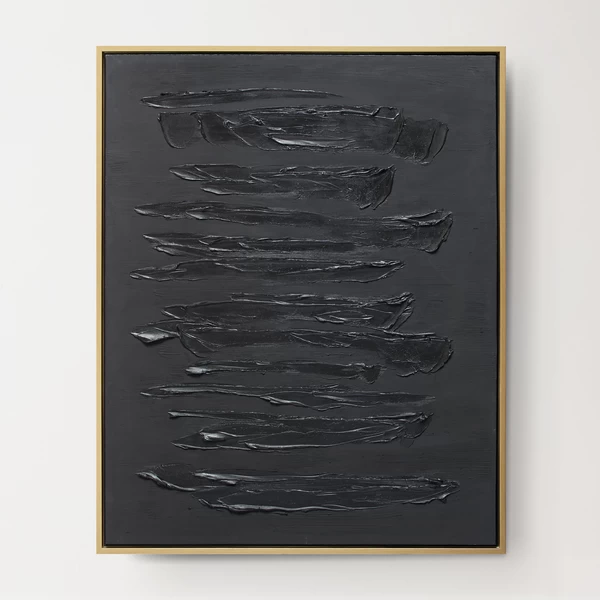 Bold brushstrokes in a moody, dark palette add an incredible element of texture and drama to this abstraction. Painted on canvas, this piece is displayed in a gold floater frame.