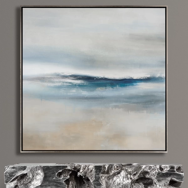 Rendered with a hazy, atmospheric quality, this abstraction of a seascape from artist Mari Urasawa adds a serene, modern note to any space. Printed on gallery-wrapped canvas with an image brush gel finish for added texture, this piece is displayed in a silver floater frame.
