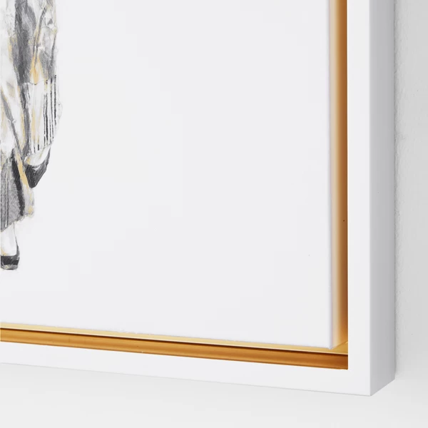 - Set in a white floater frame that has a gold inner frame
