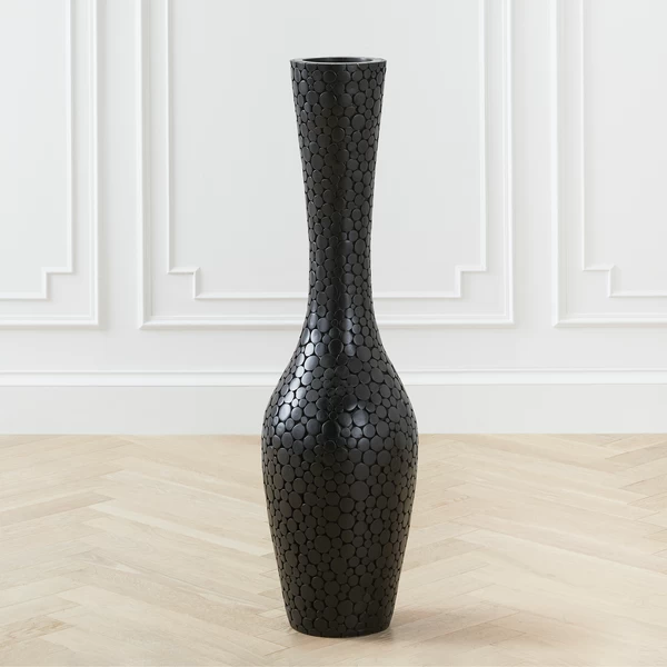 Weāve combined clean, contemporary design with the organic sensibility of natural materials to create our exclusive Black Oslo Vase. The simple shape of the large vase is crafted in a base of fiberglass, with a hand-applied overlay of intricately arranged flat coin-shaped pieces of wood. A smart glossy Black finish accents the modern appeal.