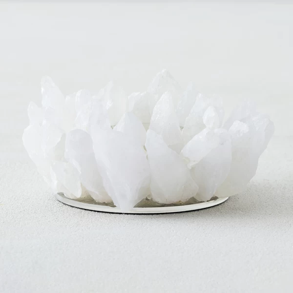 Our White Quartz Crystal tealight holder is made of authentic quartz crystals to create the ultimate in dramatic candlelight. A complex arrangement of the crystals is surrounds a glass cup which holds the candle, emanating light through the semi-transparent quartz for an ethereal ambience.