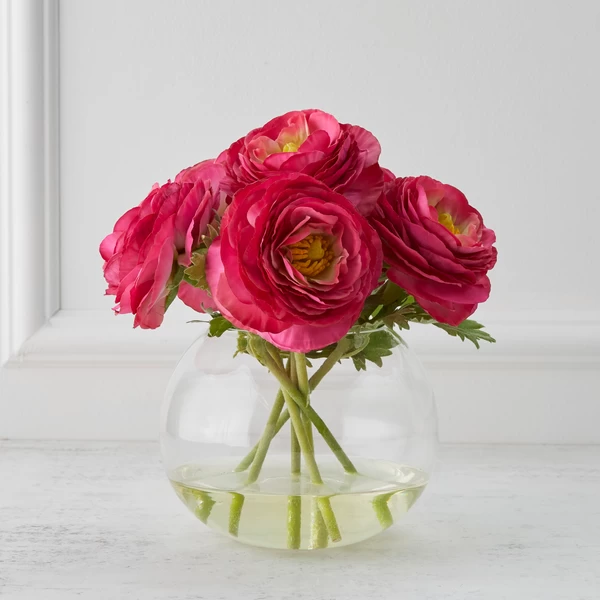 Housed in a glass vase, this stunning faux-ranunculus arrangement will look lush and lifelike all year long. Still “water” adds a realistic touch.