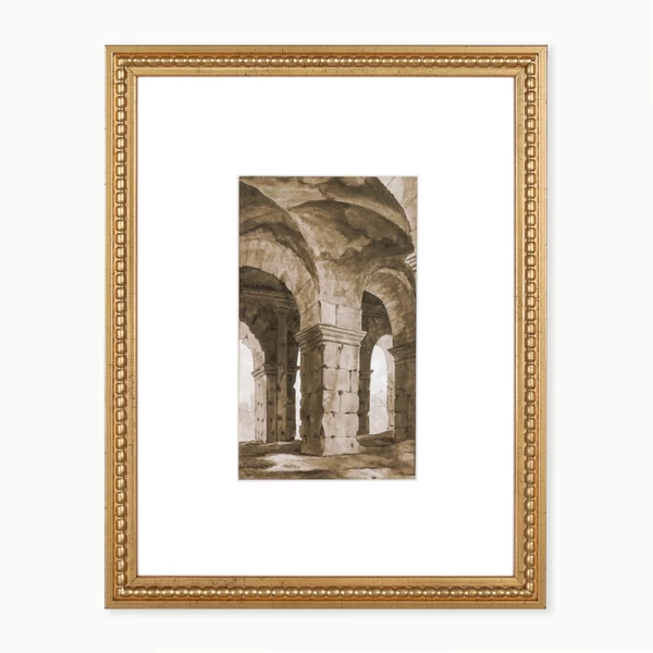 Roman Arches is a framed graphic under glass with a white mat and beaded gold frame.
