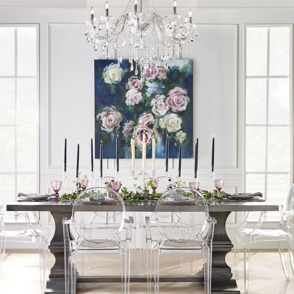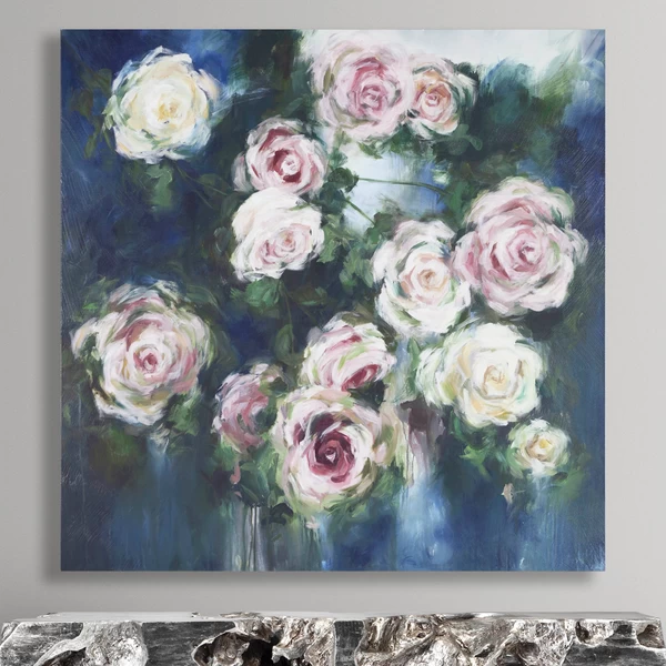 Featuring lush roses that pop against a dark, moody background, this work from artist Ann Duffy is printed on gallery-wrapped canvas with a hand-applied image brush gel finish for added texture.