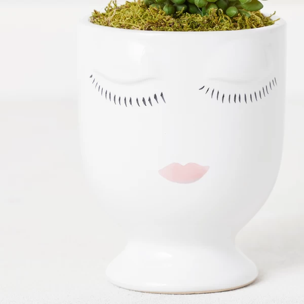 The playful combination of vibrant greens and a painted face adds a delightful and low-maintenance accent to your home or office decor.