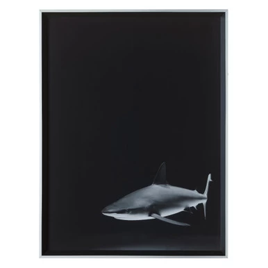 This captivating shark print from photographer Irene Suchocki enlivens any wall with its dynamic composition and moody, high-contrast palette. Printed on paper, this piece is displayed under glass in a black-and-silver frame.