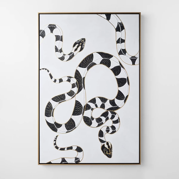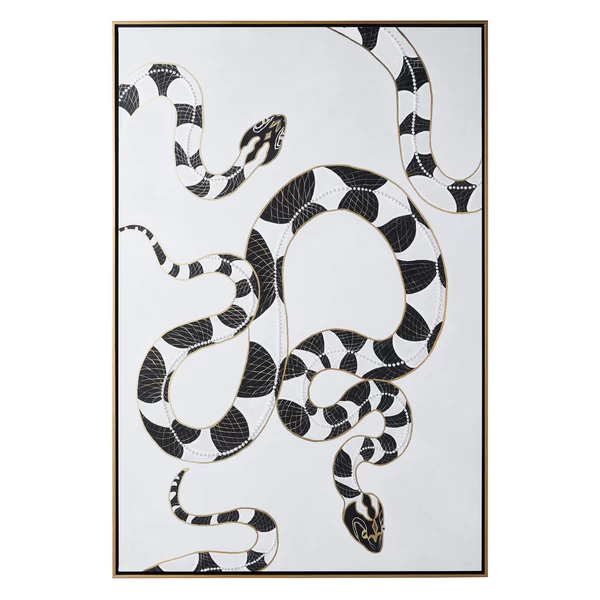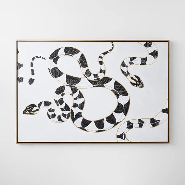Like Eve, you’ll be tempted by the serpent in this painting. The monochromatic image is easily incorporated into your decor, and it makes a stunning visual statement. This piece is created by printing the image on canvas with “diamond dust” glitter and hand-embellishing texture on it. Finished with an image brush gel, this piece is set in a gold floater frame.