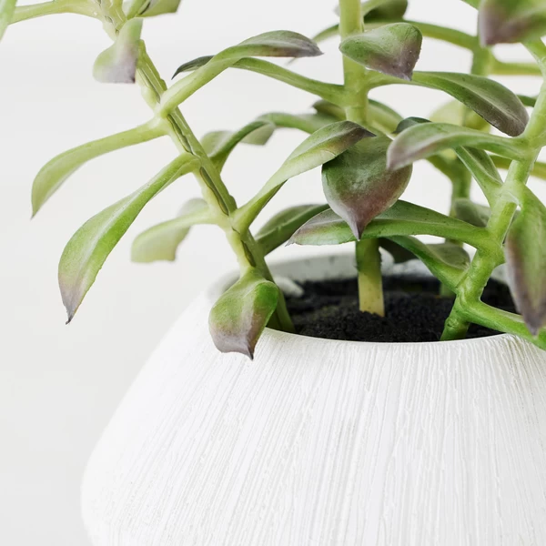A visually stunning faux arrangement featuring tree succulents elegantly arranged in a white ceramic planter.