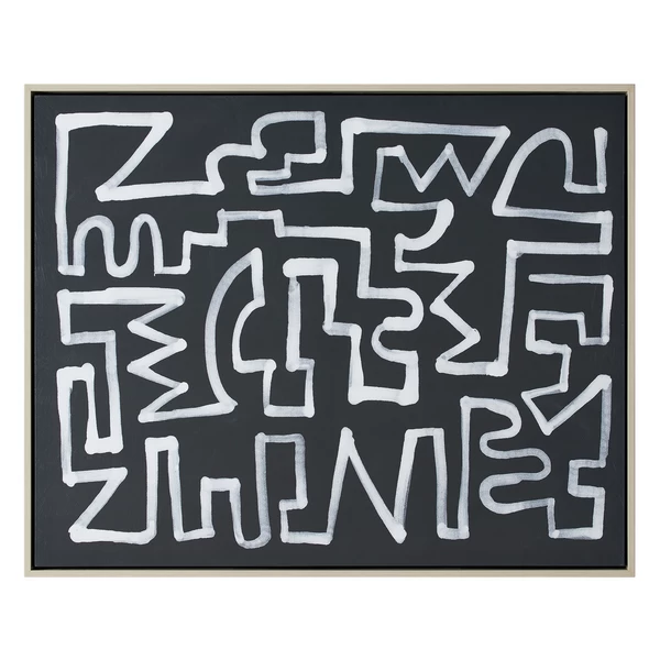 Printed on canvas and set off with a light wood-finished floater frame, this abstraction from artist Danielle Davis enlivens any wall with its bold, tribal-inspired design and high-contrast palette.