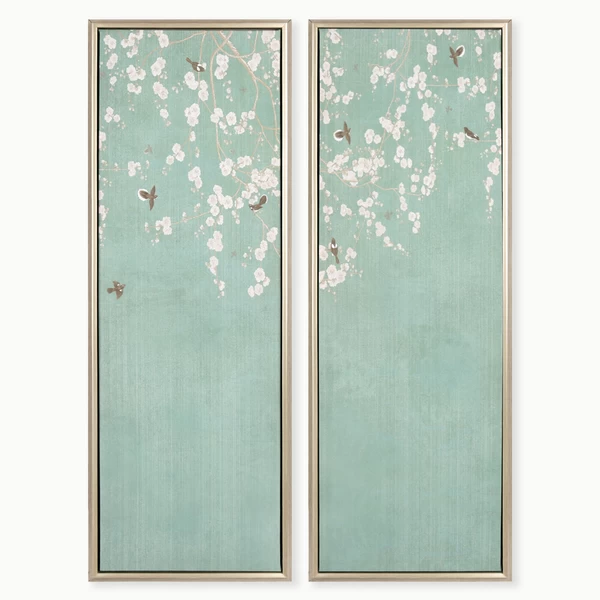 White Blossoms is a gallery wrapped canvases with hand-applied metallic champagne embellishment set in blonde and champagne (2-tone) floater frames.  Set of 2.
